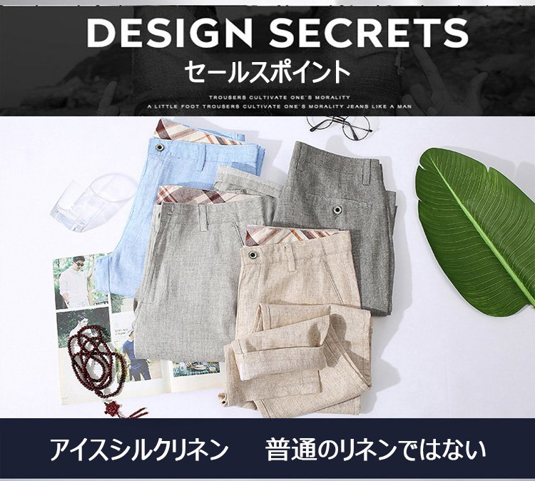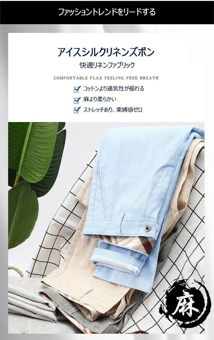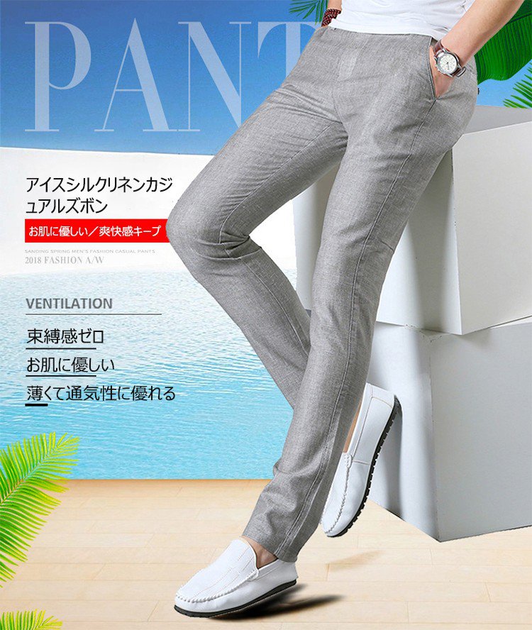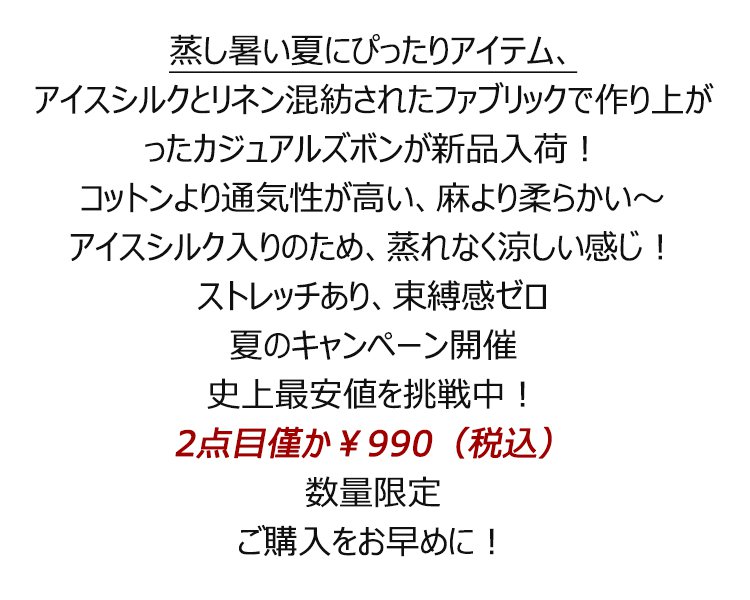 蒸し暑い夏の必須アイテム、 アイスシルクとリネン混紡されたファブリックで作り上がったカジュアルズボンが新品殺到! コットンより通気性が高い、麻より柔らかい~ アイスシルク入りのため、足は蒸れなく涼しい感じ!ストレッチあり、束縛感ゼロ 夏のキャンペーン開催 史上最安値を挑戦中! 2点目僅か¥990(税込) 数量限定 ご購入をお早めに!